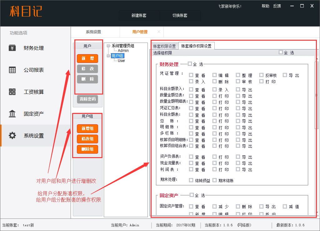 2.网络版:可以多个用户使用,可以在”系统设置“--”用户管理“模块对用户和用户组进行增删改操作,给用户分配账套权限,给用户组分配账套操作权限。用户可以在”系统设置“--”密码设置“模块对密码和密保进行设置