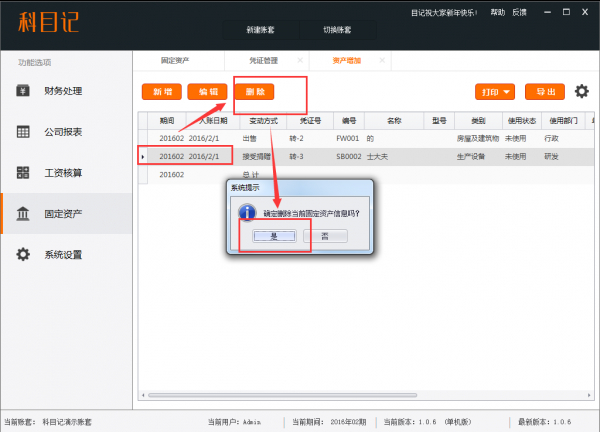 在”资产增加“界面,选中需要删除的固定资产,点击”删除“按钮即可