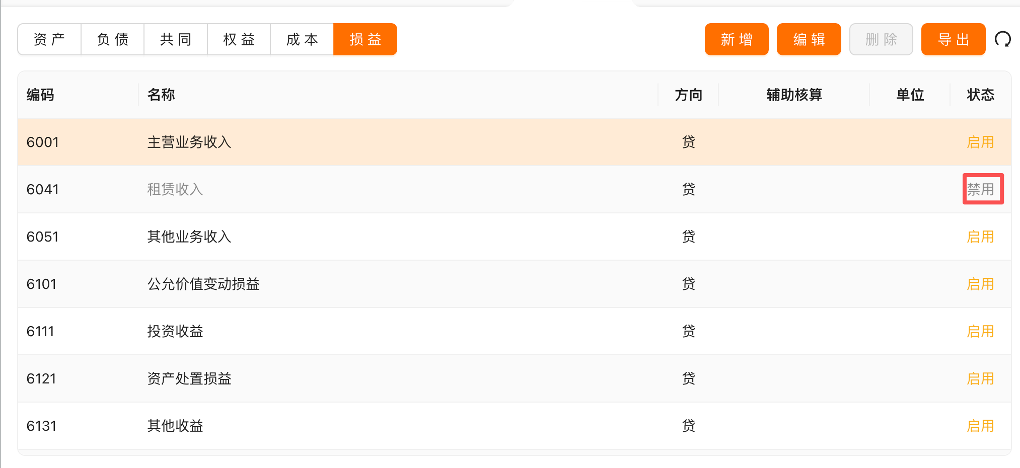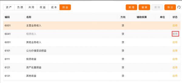 在【系统设置】->【科目维护】界面,在科目对应的【状态】点击即可切换禁用或启用科目