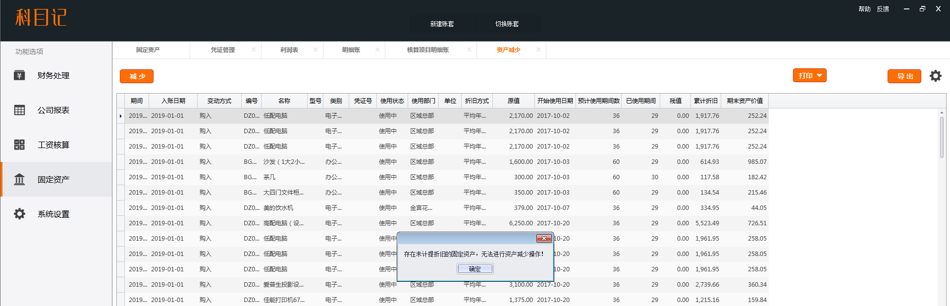 本期已计提折旧,但是在减少固定资产时,出现如图提示,怎么处理?
