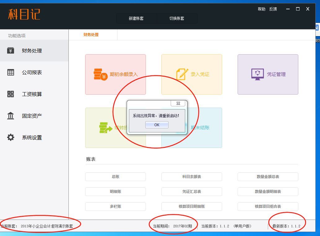 亲,新电脑,安装完软件后,无论是进演示账套,还是重新新建账套,进去后都提示系统异常,请重新启动,怎么解决?
