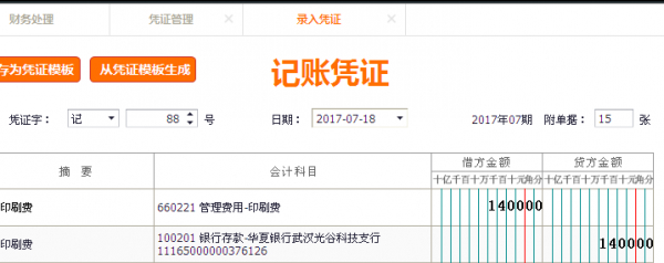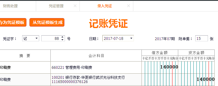 凭证录入界面:录入时借方金额在第一行项目,贷方金额在第二行项目。